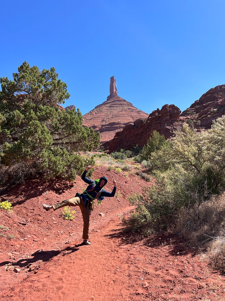 After breaking down camp, we drove out to Castle Valley, running on nothing but a single Pop-Tart and excitement. The approach was long and steep, and it wasn’t until we were halfway to the base that we realized we hadn’t eaten a real breakfast. When we finally reached the tower, we saw another party already starting up the North Chimneys. They were a party of 3 and they weren’t moving particularly fast, so instead of waiting, we decided to go for Plan B — the Kor Ingalls route. It was a bit harder, but I’d brought all the right gear and had mentally prepared to lead every pitch.