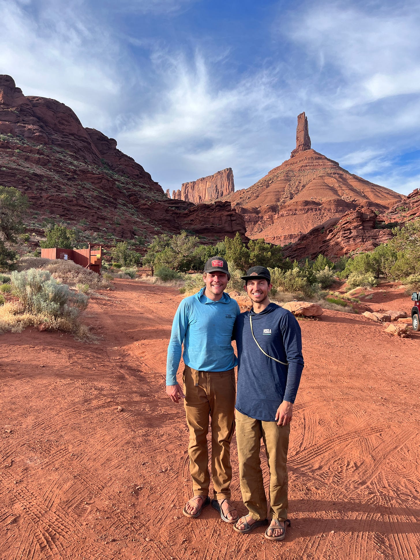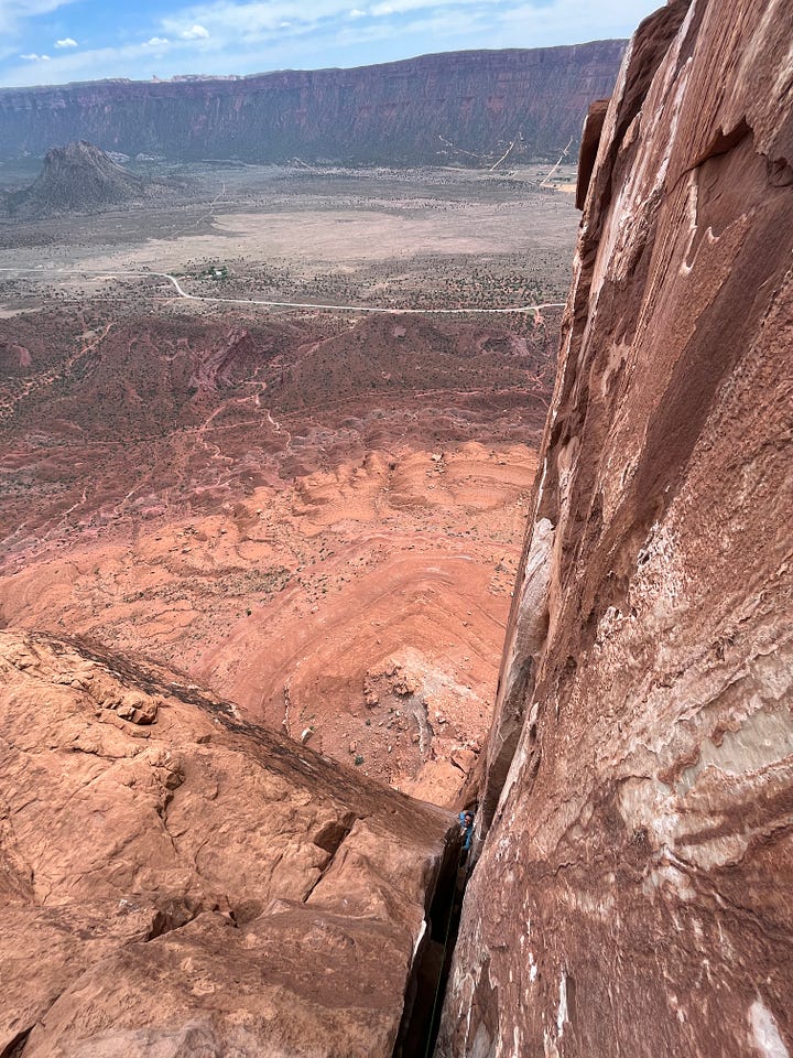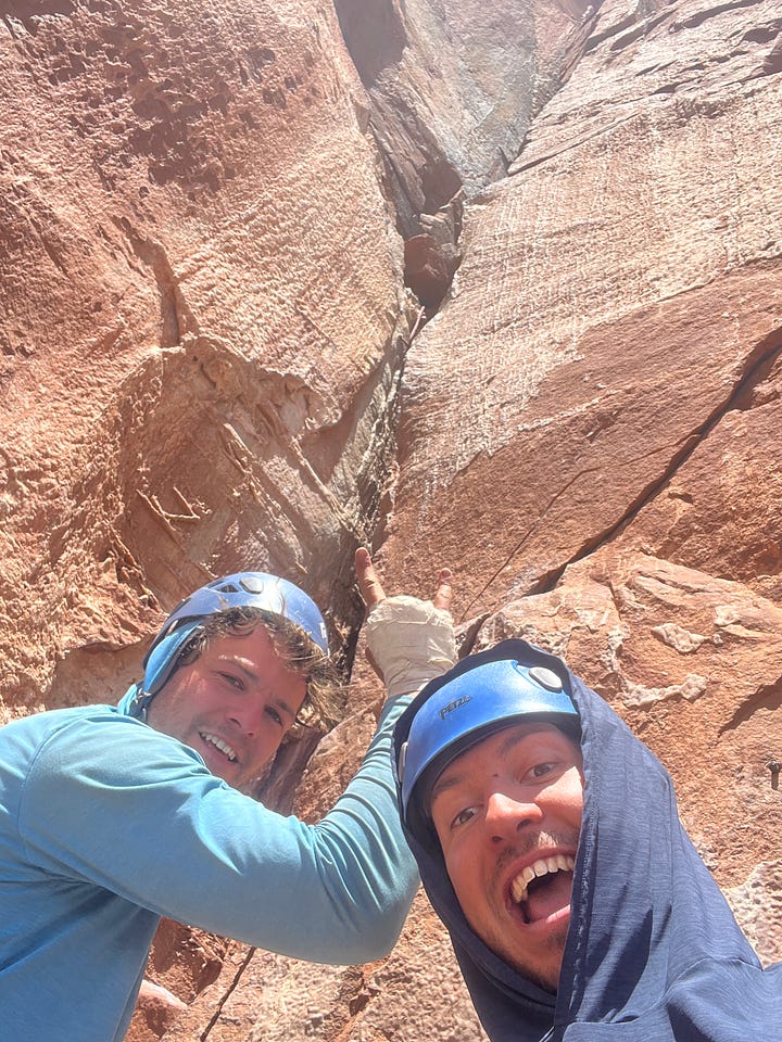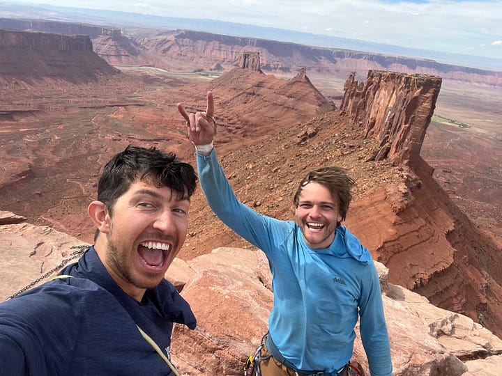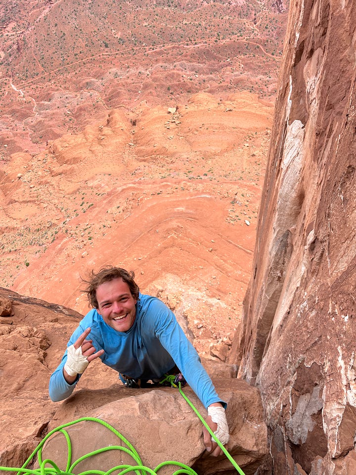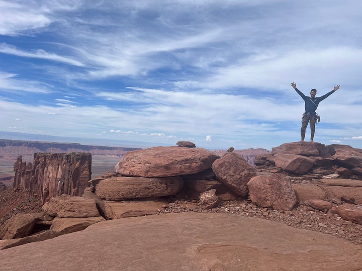 The final pitch was short but exposed. A little traverse led to a face climb that pulled us straight onto the summit. As soon as I topped out, I was hit by strong, refreshing wind. The La Sal Mountains were capped in snow behind us, a wild contrast to the red desert below. When Eric joined me, we just sat there catching our breath, feeling small and proud all at once. I even tried flying a drone for the first time — the footage was shaky, but it captured the incredible tower we were perched upon.